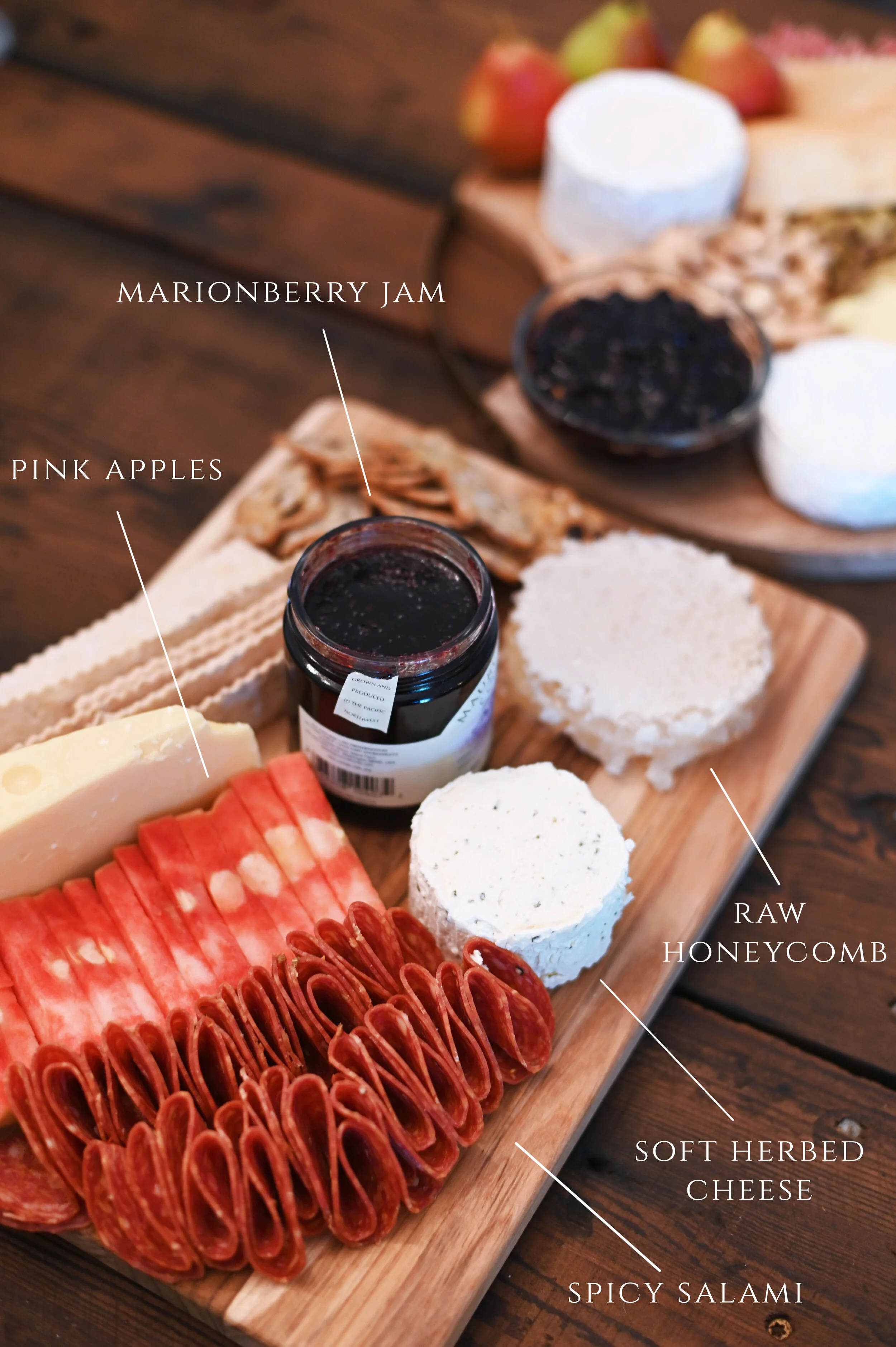 1. The Cheese: We always start with the cheese when building our cheese board. The number and variety of cheeses for a cheese board depends on the size of your gathering and to a certain degree to the taste of your guests. A safe place to start is with two or three cheeses with various tastes and textures such as an herbed goat cheese, a cheddar, and a brie. We are fortunate to have amazing local cheese in the area such as Cowgirl Creamery and Point Reyes Farmstead Cheese Co. that have incredible local options to serve. This is a good way to go if you can find something like this in your area to ensure quality and freshness of the product. A good tip is to buy a couple things you know for sure your guests will take too and a couple new cheeses to try. This ensures you are never bored but never hungry.