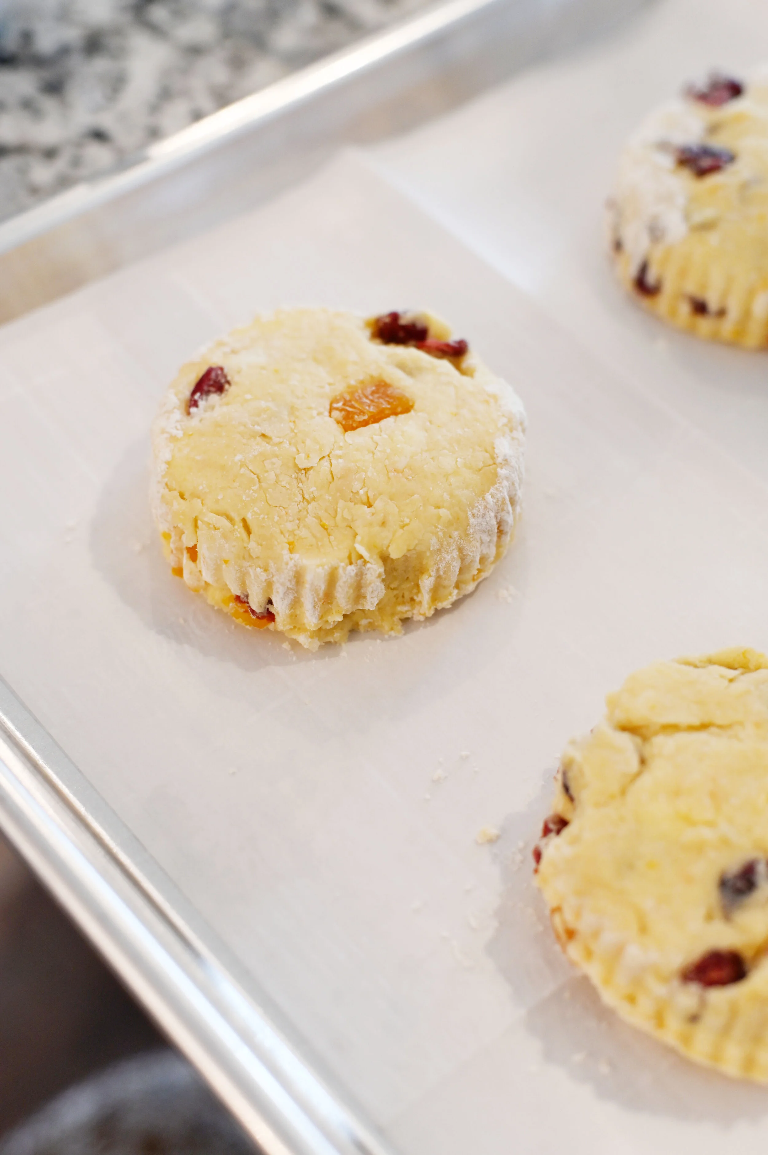 Whisk the eggs and cream together. Then slowly add to the butter/flour mixture and mix until just combined. Don’t over mix. Finally add the dried fruit and mix for just seconds longer. Tip the dough out onto a floured surface and knead slightly until the mixture comes together. Pat down with your hands or use a rolling pin to flatten into a large round that is 1 inch thick. We used a 3 inch fluted biscuit cutter to cut rounds out of the dough. You can cut into triangles, squares, or make smaller circles if you prefer. Adjust the baking time if necessary.