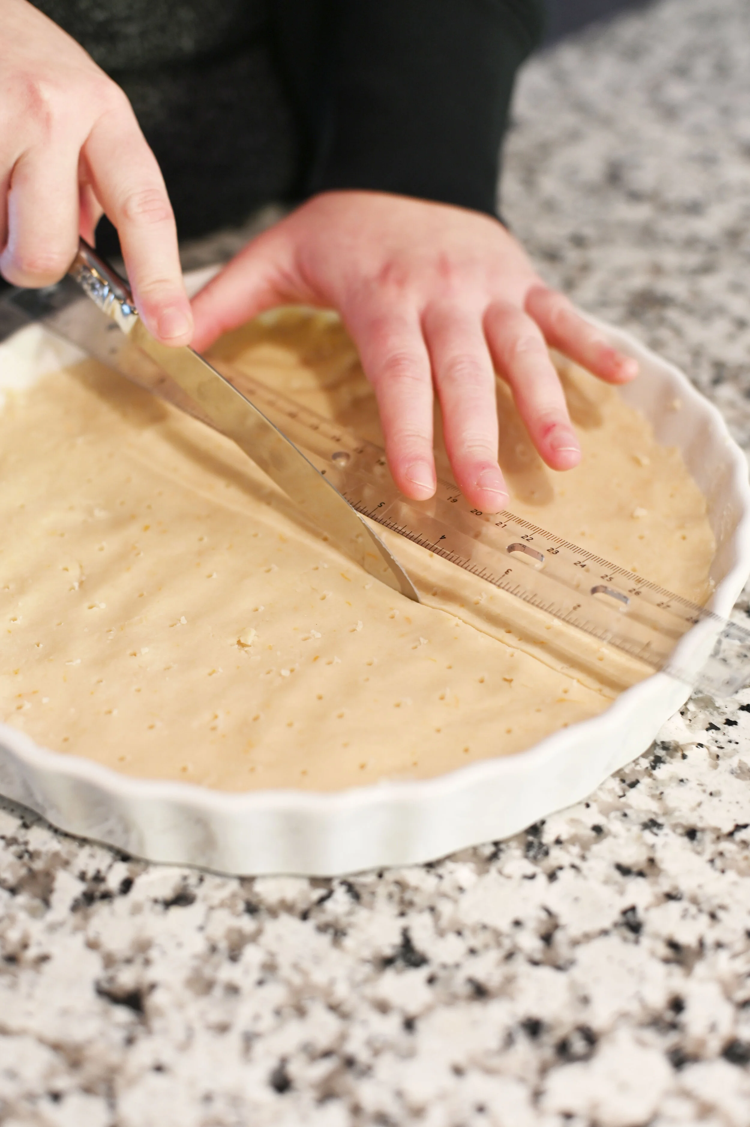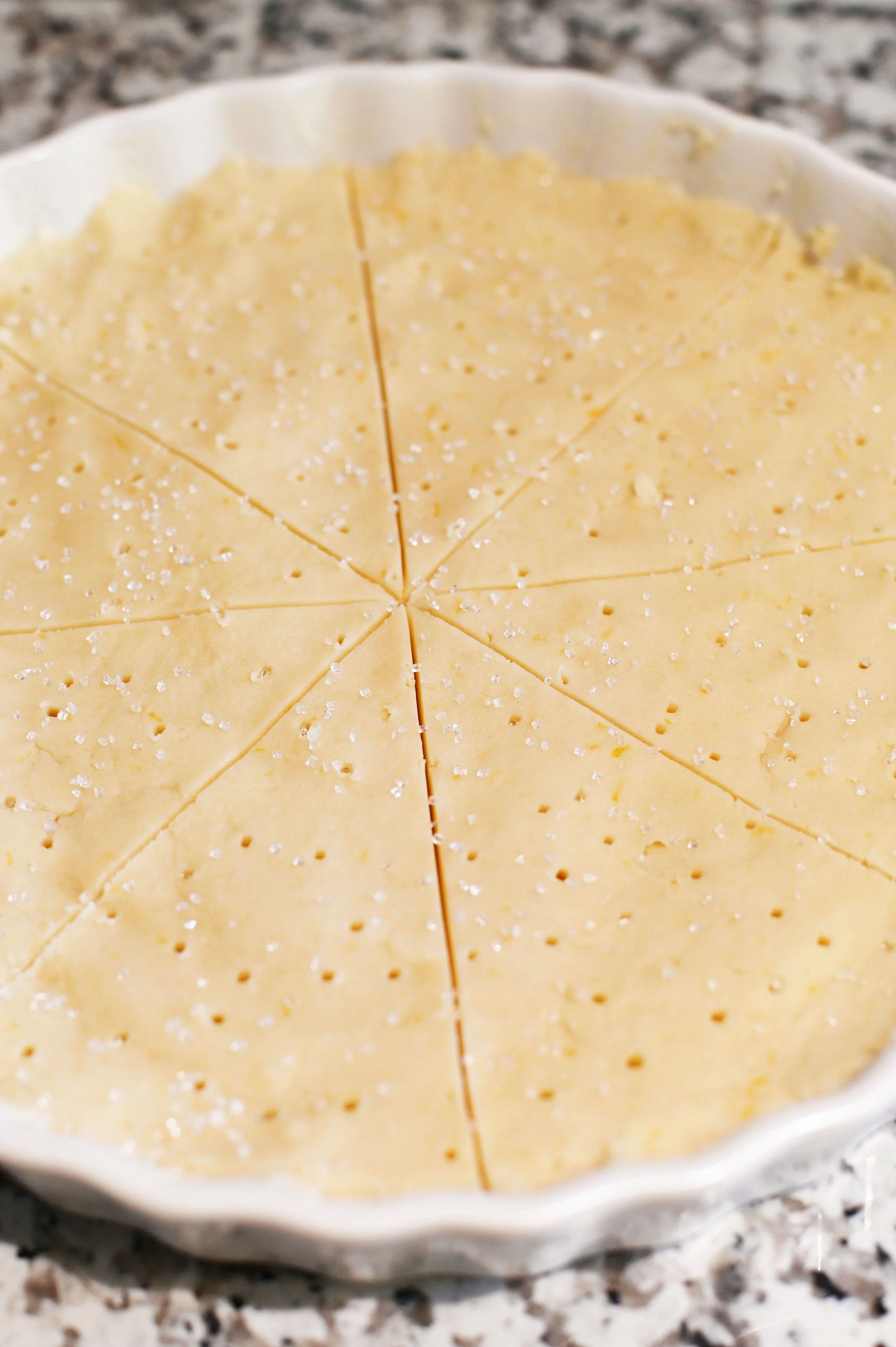 4. When 20 minutes are up, remove the shortbread from the refrigerator and use a knife to cut into 8 wedges. Then use a skewer to dock the shortbread ever 1/4 inch. Sprinkle with sparkling sugar.