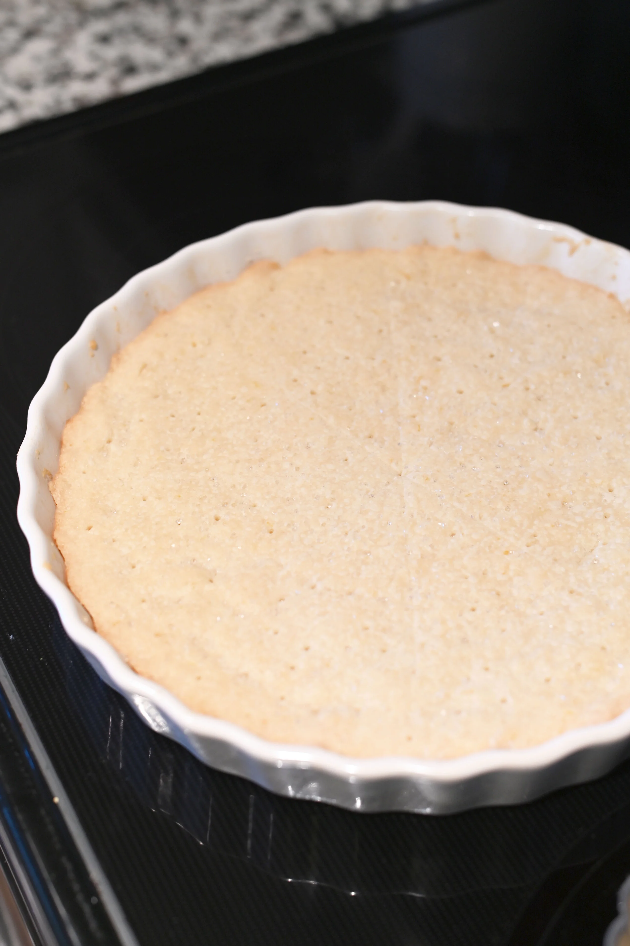 2. Press dough into a buttered 10 inch tart pan with removable bottom. Place on the refrigerator and cool for 20 minutes.