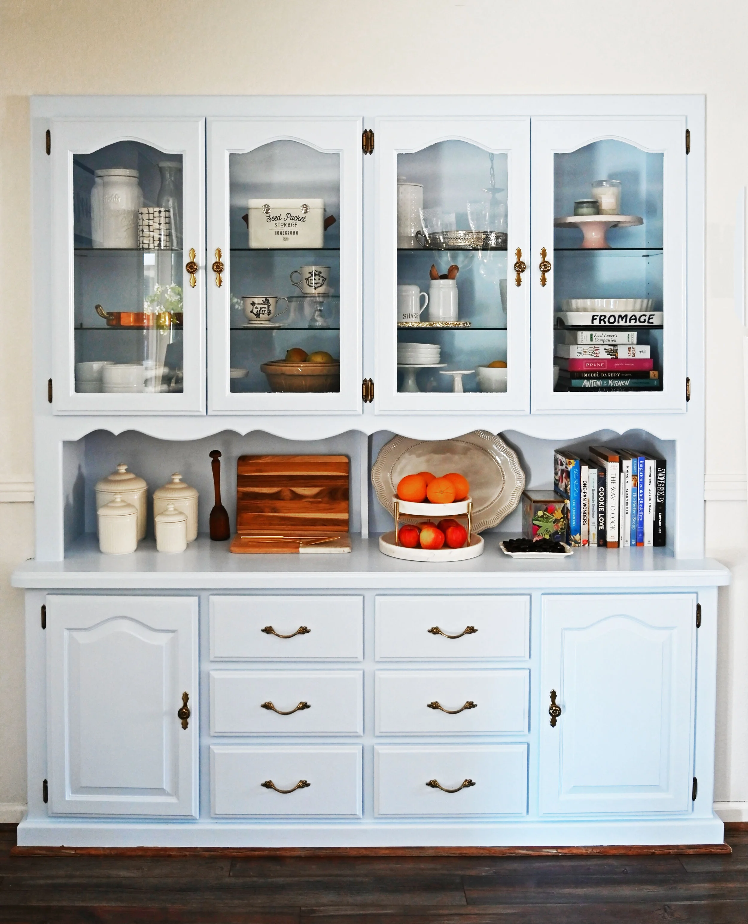 On that note, let’s address the power of paint. I depend endlessly on painting projects for creating an incredible change in my home with little cost and little effort. I have painted entryways on Friday nights to brighten up the walkway, I have spray painted bed frames to give them a new life, and I have changed the color of my front door like I change my shoes in the morning. Paint can change the size of a room, define areas in your home, and make something like an old yellowed built in look like new. Once we picked a paint color for this project, we tackled the uplift head on. Once it was primed, painted, and put back together, the whole room looked like new. The blue looks both modern and rustic tying in the aesthetic of the kitchen and the sitting area with ease. The color even allowed for the use of the old hardware which seemed to be given new life with the change. I was fortunate enough to have many of the paint supplies already on hand so the entire project was the cost of paint and the time it took to complete. It is truly an uplift for the cabinet, my home, and my spirit.