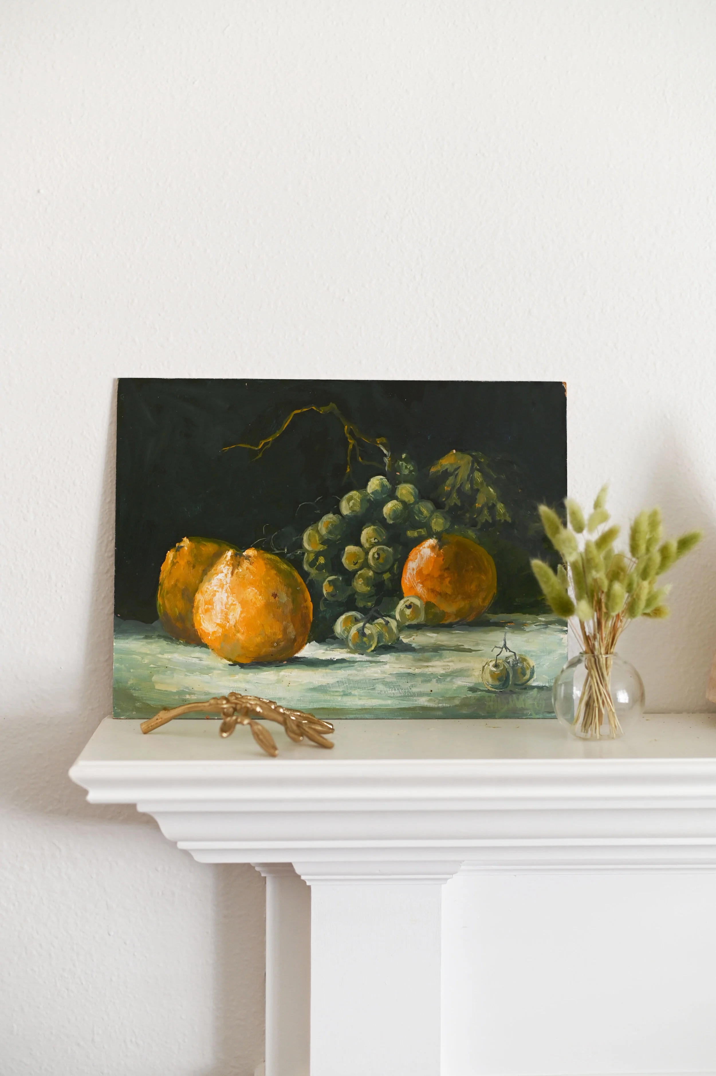 If you’re anything like me, you have probably spent time rummaging through old family photos and knick-knacks that have previously been tossed to the side. This painting above I actually already owned! It is an old painting made by a distant relative in the 1950s. I happened across it one day while organizing old boxes. If you can see its potential, there is really nothing quite like getting mileage and enjoyment out of the items you already own. This painting paired perfectly on the mantle with a few dried bunny tails and a small brass olive branch - giving new life to unexpected pieces.
