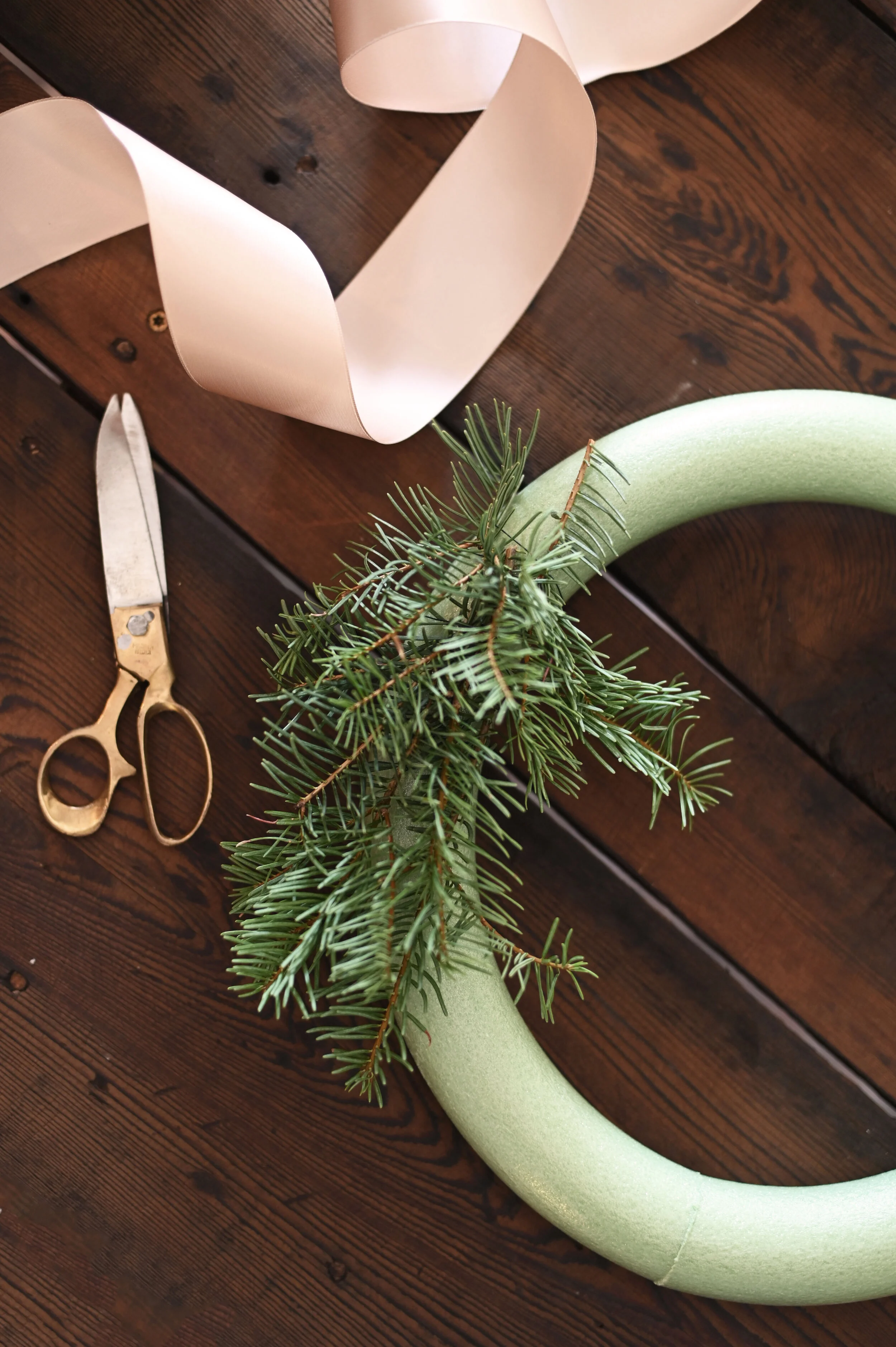 Secure piece of greenery to the wreath frame by wrapping the wire around the back and securing again by twisting multiple times.