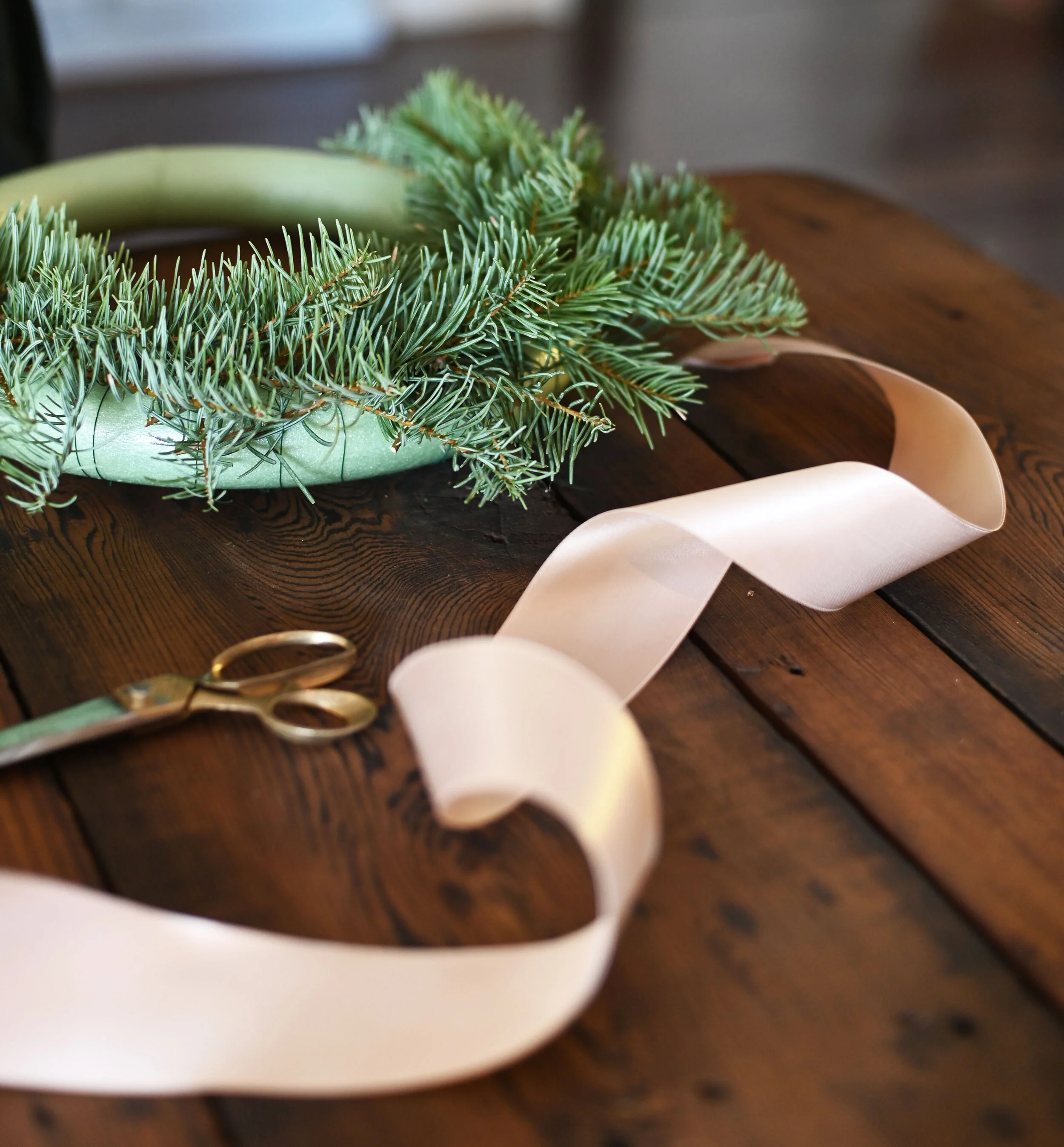 Once your wreath is filled up to your satisfaction, secure your decoration to the wreath with the floral wire. Location and type of decoration is up to you. For a simple and sophisticated look, we tied a double bow with wired neutral ribbon and centered it on the bottom of the wreath.