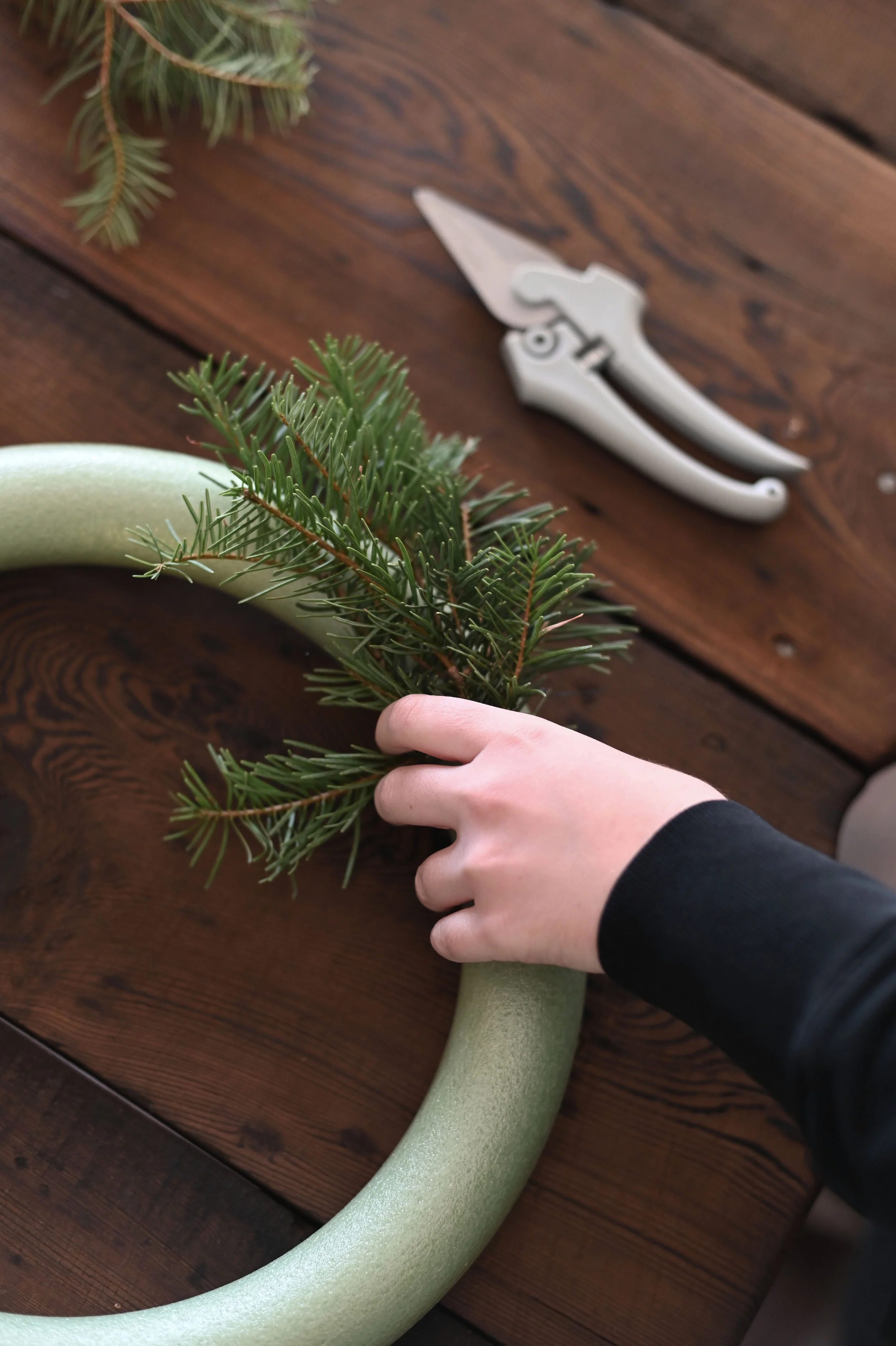 Build up the wreath by adding stems until all of the internal structure is covered. Take care to not neglect the inside and outside edges. You wreath will look more full if you pay close attention to these details.
