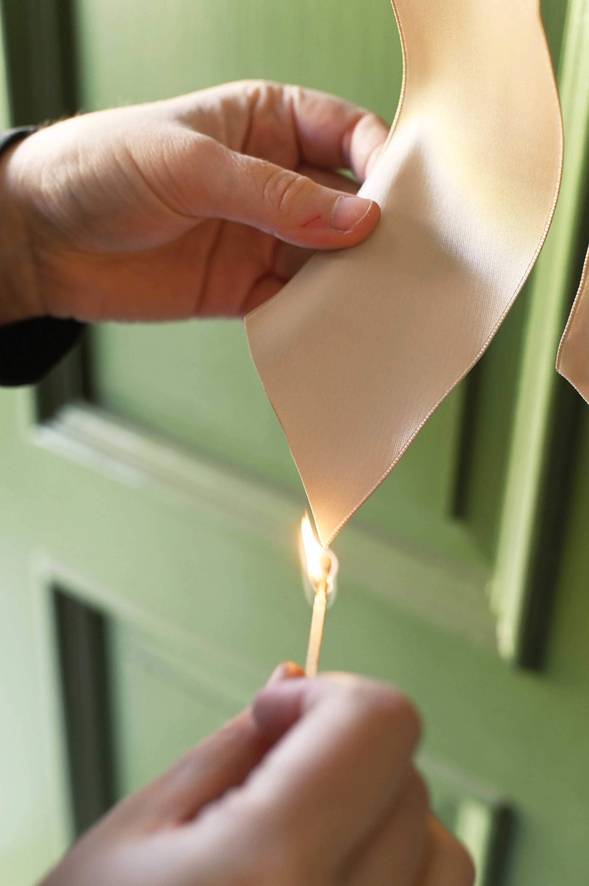 Optional* lightly burn the edges of ribbon to ensure they do not fray. Please take precaution and check that your ribbon material is not highly flammable.
